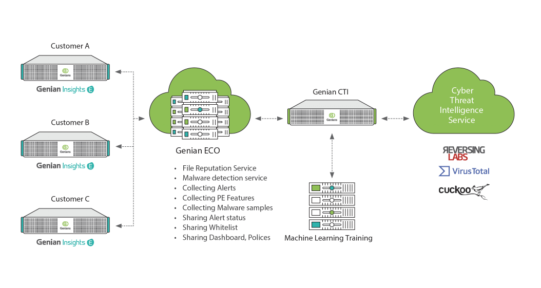 • Genian Ecosystem: Sharing file reputations, whitelists, alerts, and malicious data information among Genians’ customers to increase the accuracy of detection and decrease remediation time