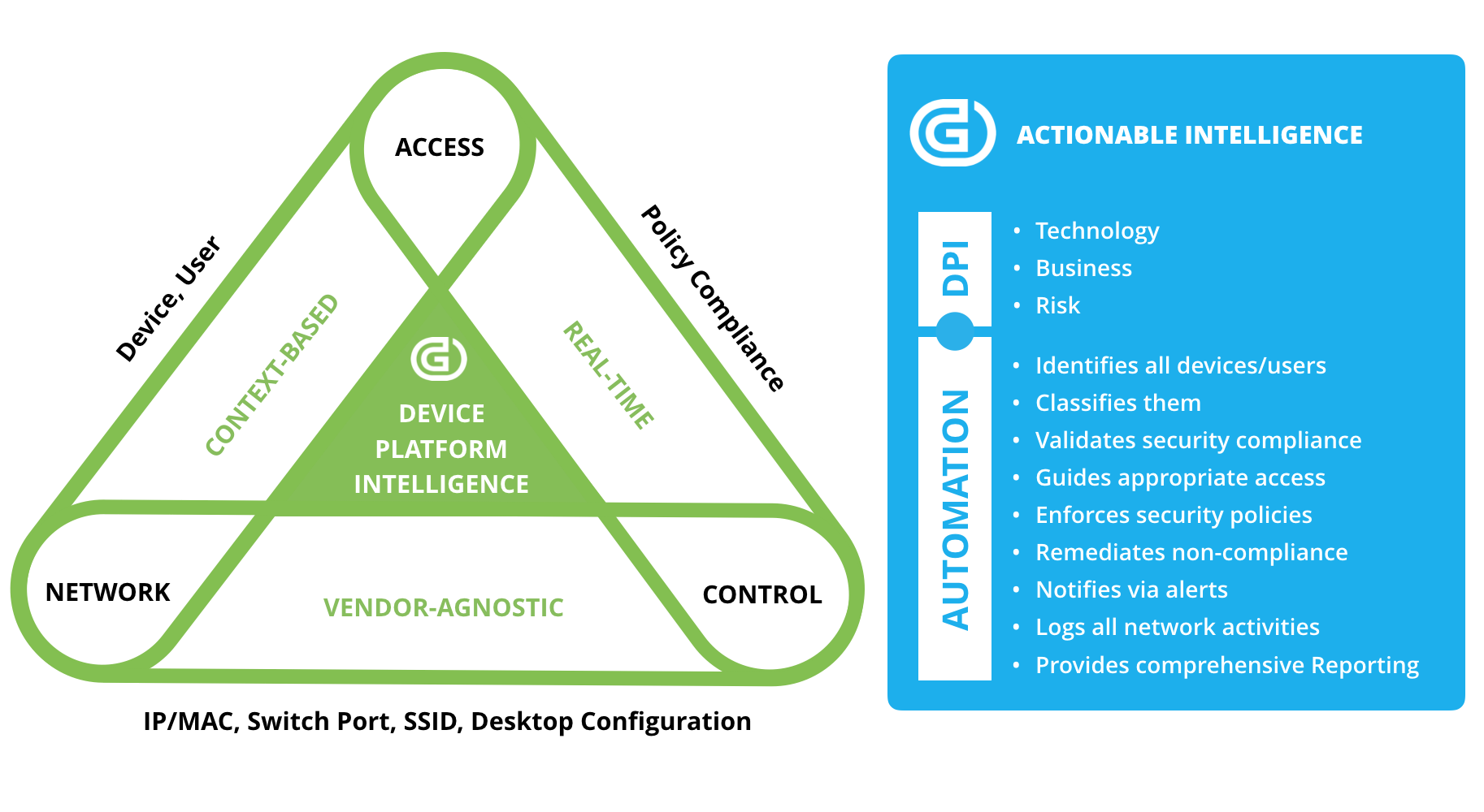 Genian NAC leverages the three “legs” of the triangle shown above to achieve and maintain network security compliance in a reliable and automated fashion. It begins this task by interrogating every device and user that attempts to connect to the network. It does so continuously, in real-time. Via the “Device Platform Intelligence” (DPI) technology at its core, Genians is able to identify all network-enabled devices, whether wired or wireless, and to provide a full array of information about each one of those devices. What kind of device is it? Who manufactured it? When does it go end-of-life? What is its IP address, its connected switch port, its associated VLAN, the state of its patch maintenance? Moreover, again via Genians’ DPI technology, it is able to do so in a vendor-agnostic manner, thus allowing full visibility into all network environments no matter which tech vendors’ switches, routers, or other appliances have been deployed.