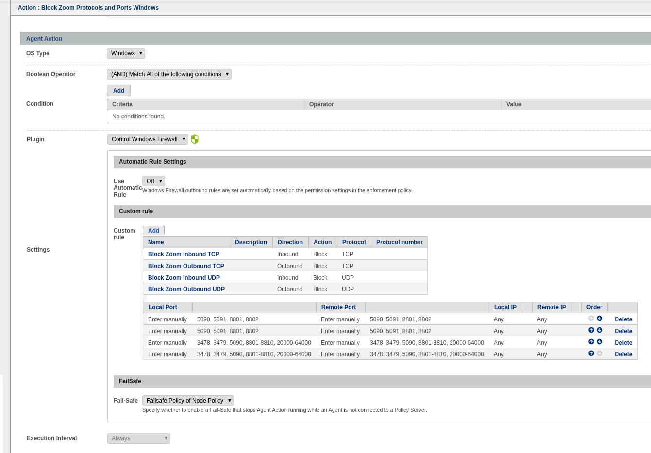 Find or configure a Node Policy that will contain the devices you wish to manage. For example, this can be accomplished by using the MAC address of any endpoint that you are managing with the agent as a grouping criteria. Configure the agent policy update interval and failsafe settings of the Node Policy to your desired settings. It is possible to configure the agent to run continually, even when disconnected from the Policy Server. Then add the agent actions desired to the Policy using the instructions below.