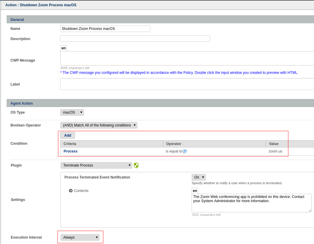 - Add an agent action using the “Terminate Process” plugin.