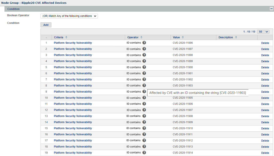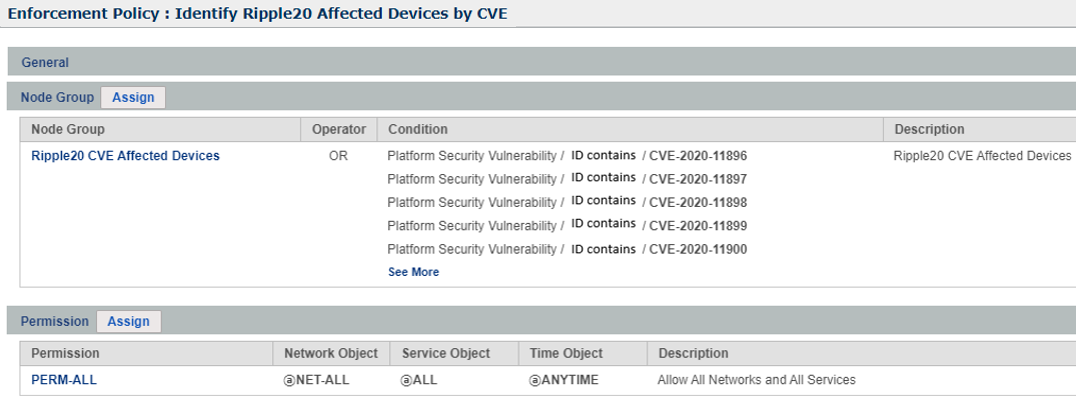 To identify these devices, we will create a Node Group and Enforcement Policy in the Genian NAC UI. The Node Group will list the 19 Ripple20 CVEs and the Enforcement Policy will allow for options later on for isolating or restricting the devices. In this example, as in the previous blog post, we will not restrict permissions since we are just auditing to locate vulnerable devices.
