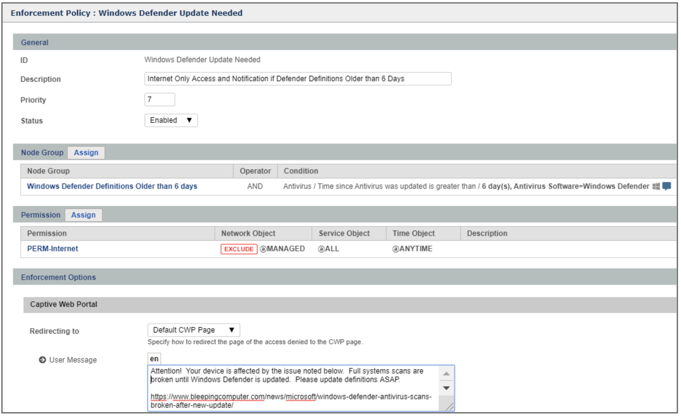 Having now identified the systems affected by this issue, Administrators can optionally take additional actions via Enforcement Policy. Notifying end users or even restricting access to Internet only until the definitions have been updated are two possible options as shown in the example below: