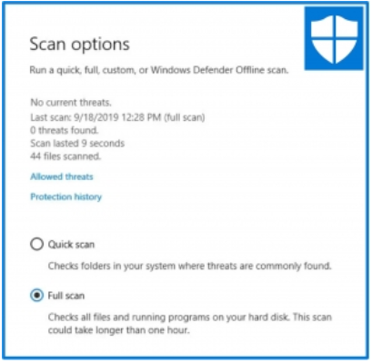 “BleepingComputer has been able to independently confirm that this is happening on our own computers that have version 4.18.1908.7 (KB4052623) installed. As you can see below, when we performed a Full scan, it only scanned 44 files and lasted 9 seconds.”