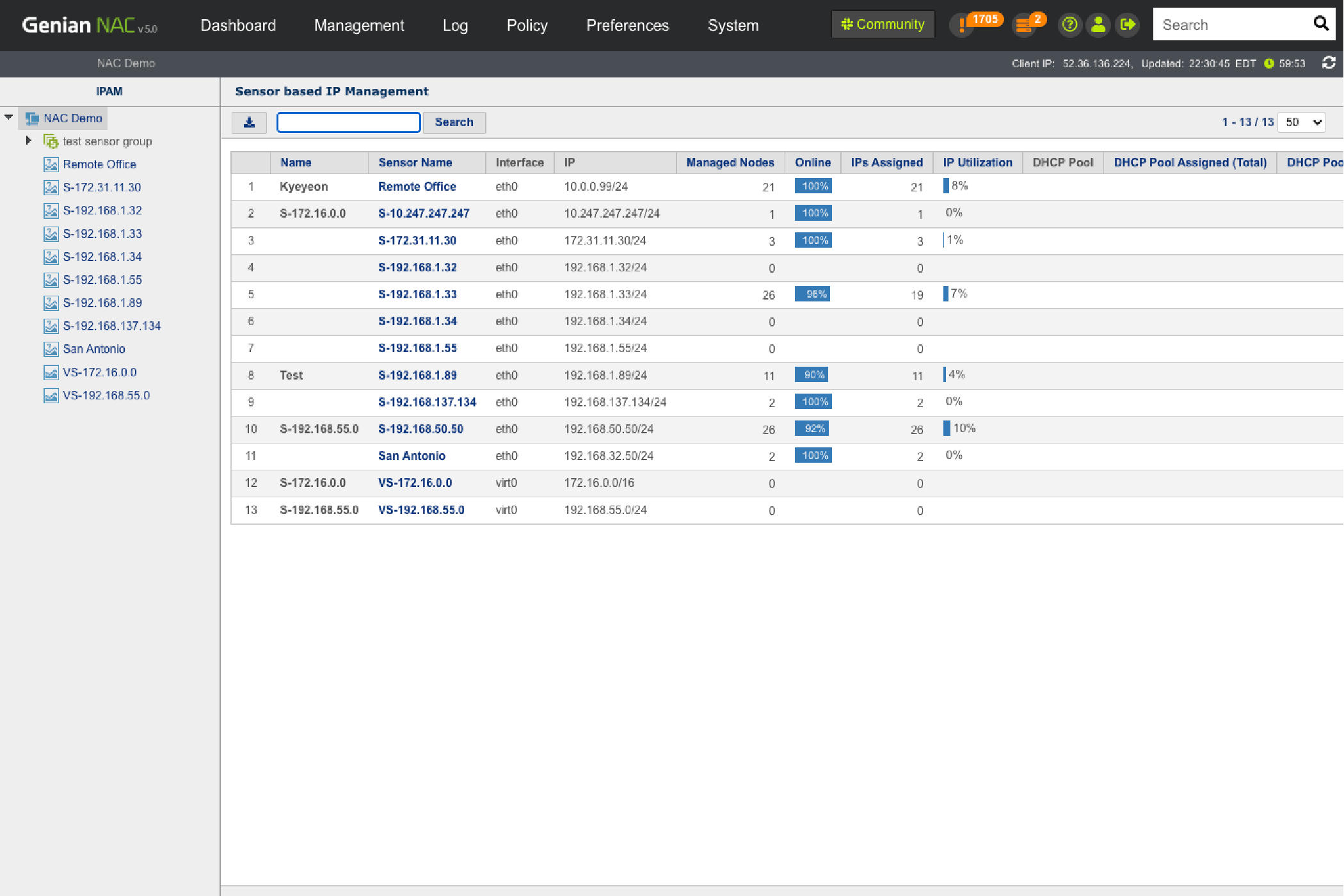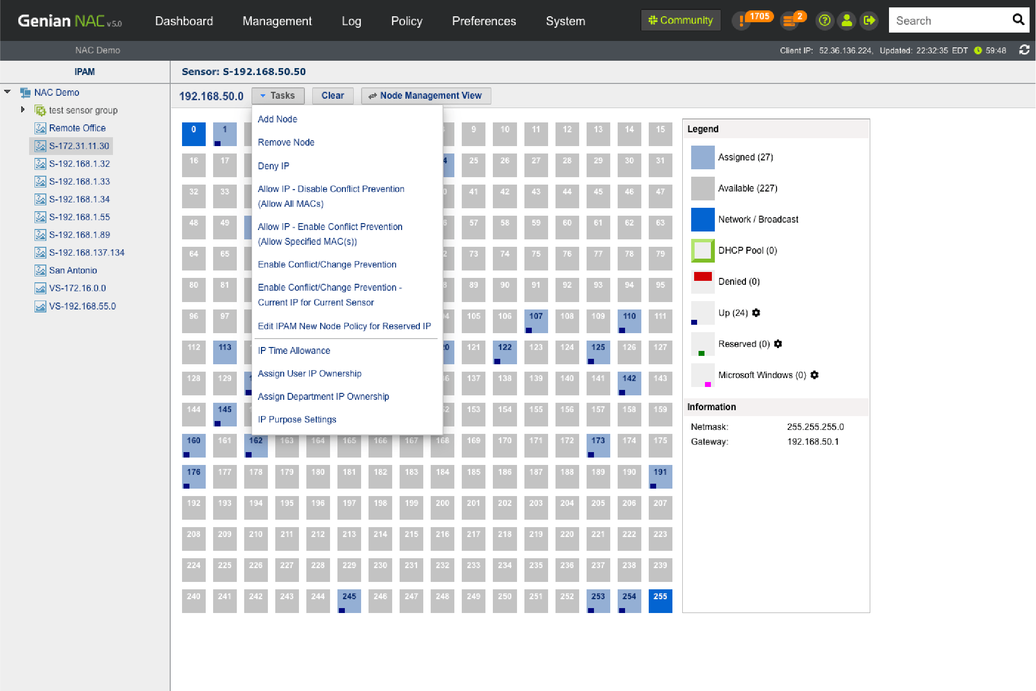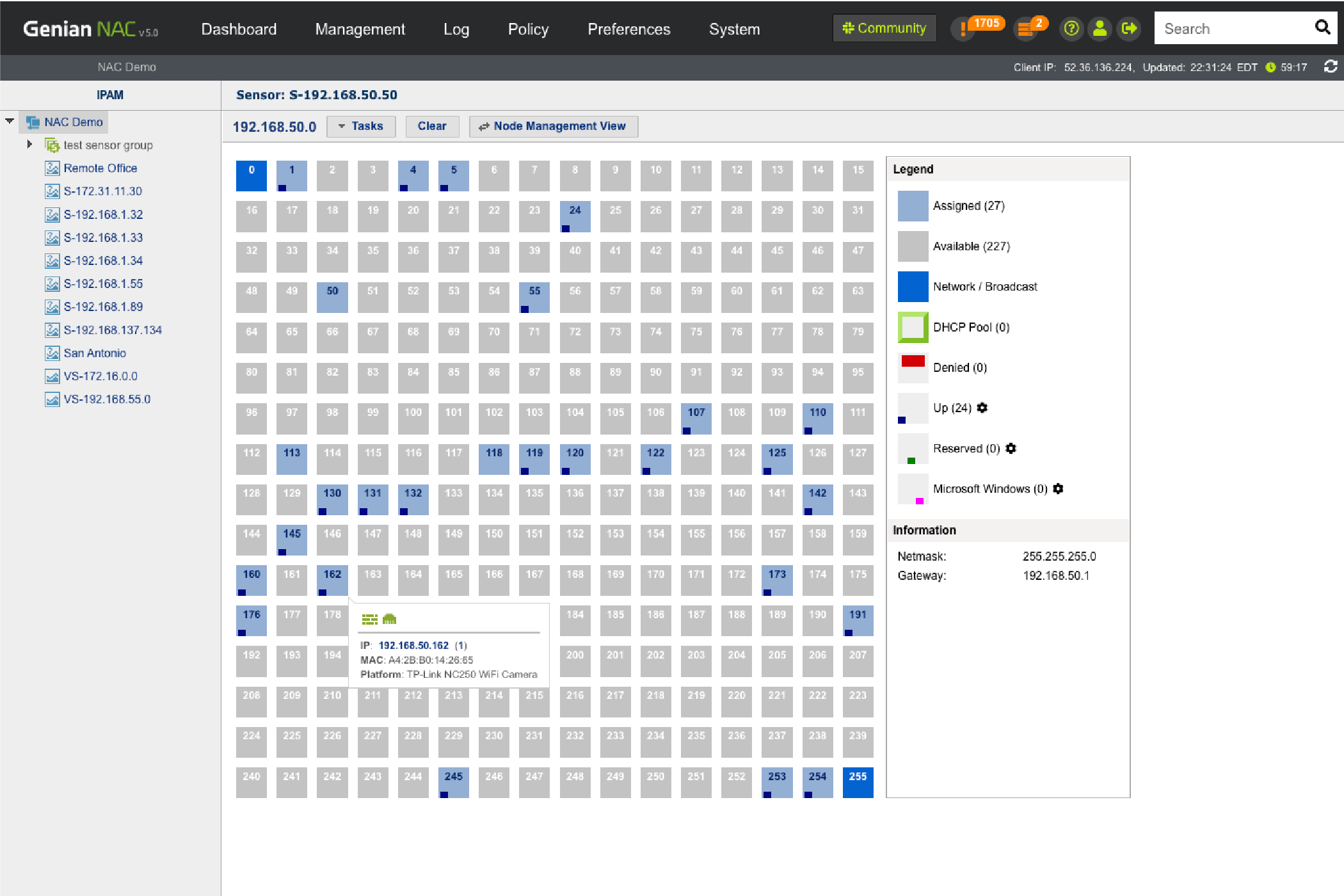 Through our intuitive IP matrix interface (Class C Subnet mask), see how many IP addresses are being used and available, which IP’s are assigned via DHCP, which are reserved, and more.