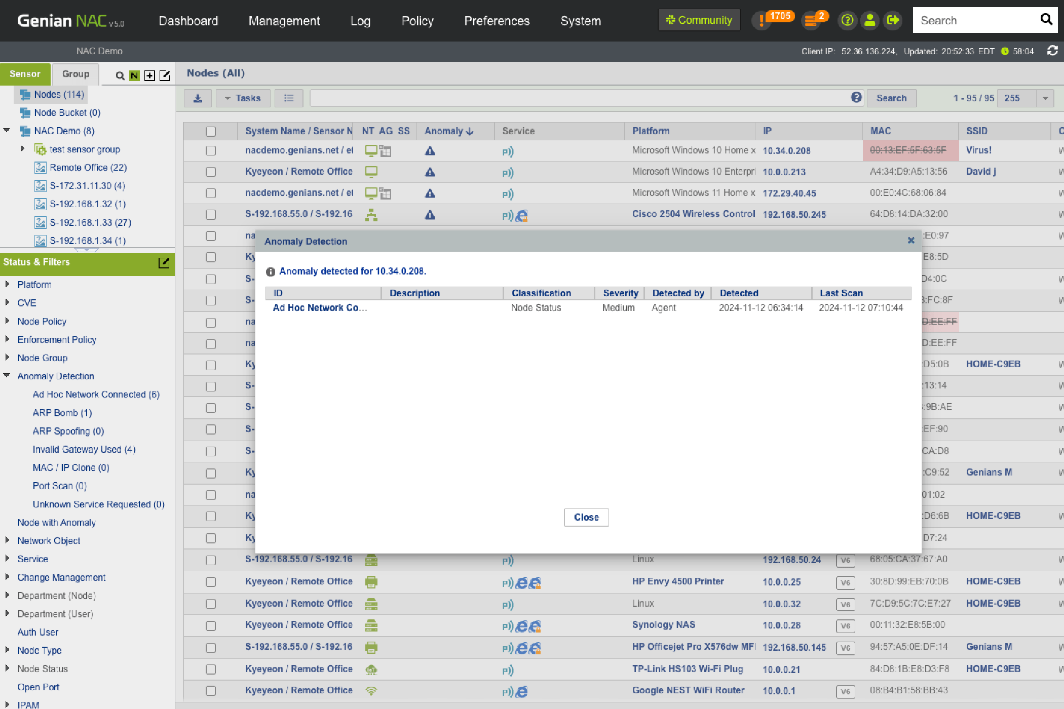 Genians’ Network Sensor has the capability of scanning all SSIDs in your network and identifying who connects to which SSIDs, capturing not only your organization’s APs but also neighboring APs and controlling what is connecting to those APs. You can allow or deny Wifi-enabled devices accessing different SSIDs based on their policy compliance by groups, such as Authorized AP, Rogue AP, Misconfigured AP, Tethering device, and more.