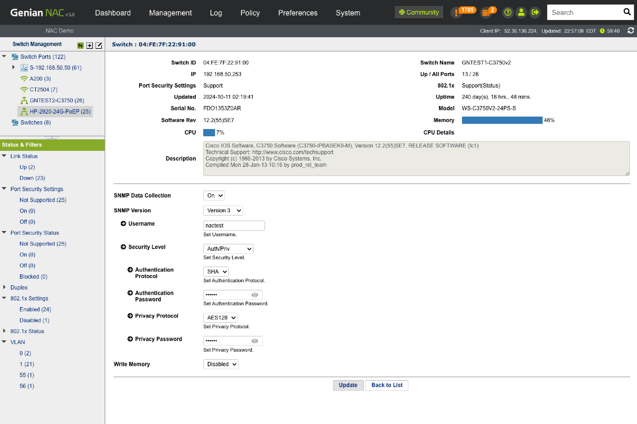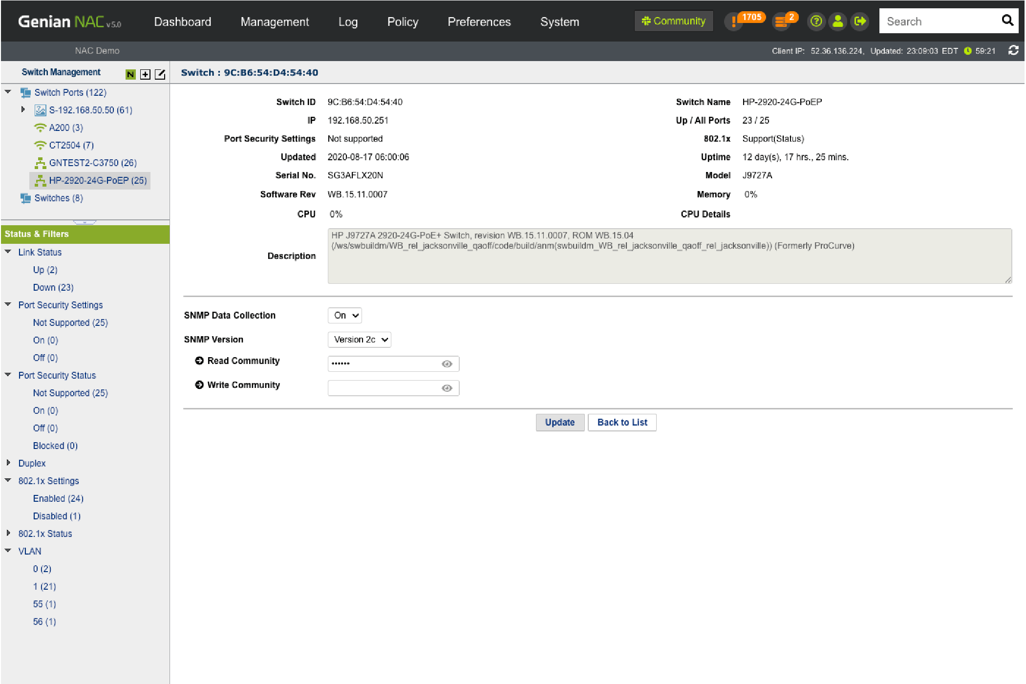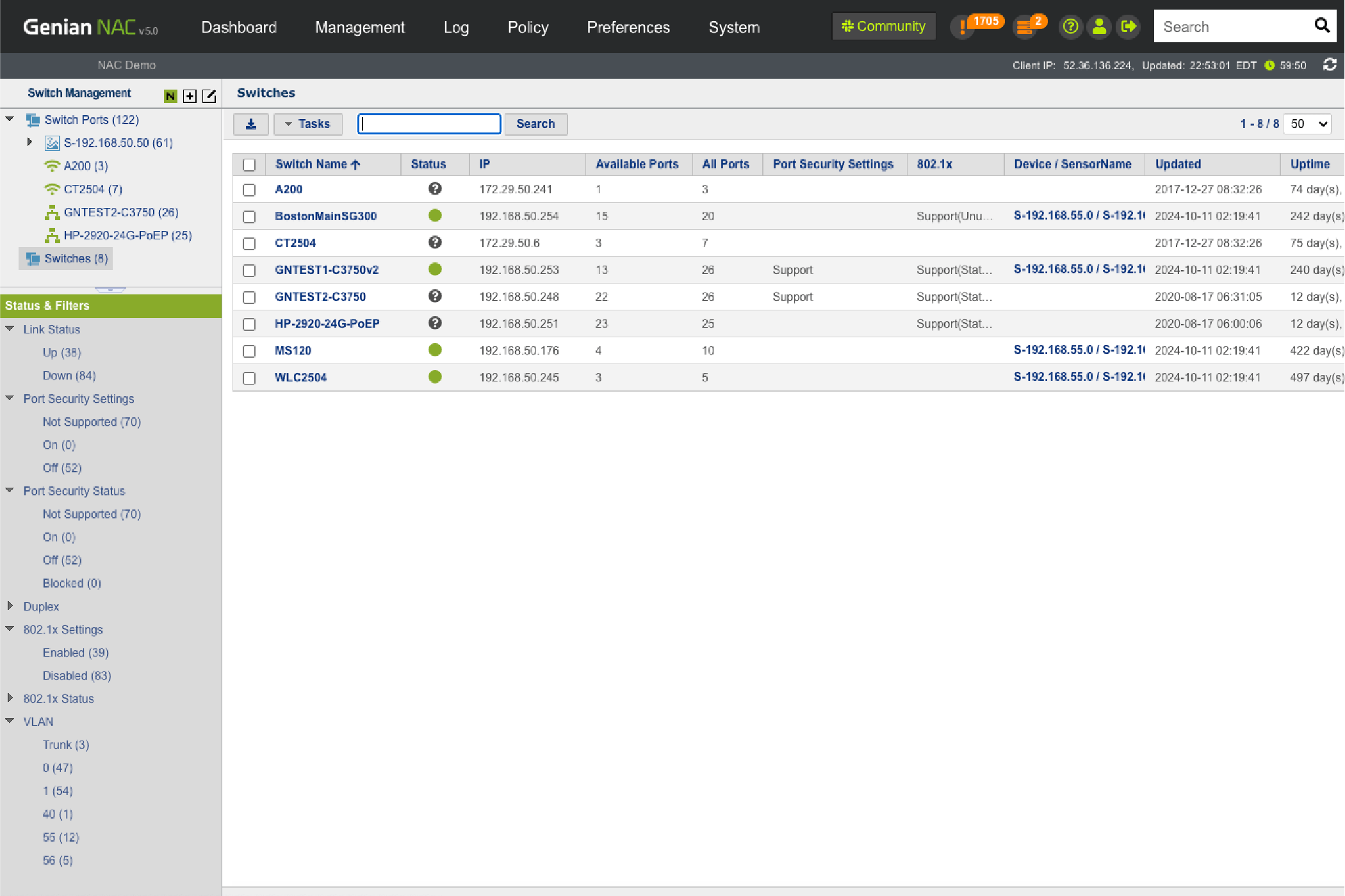 • Monitor Switch port status (Up/down, Security, 802.1x, VLAN, etc.)