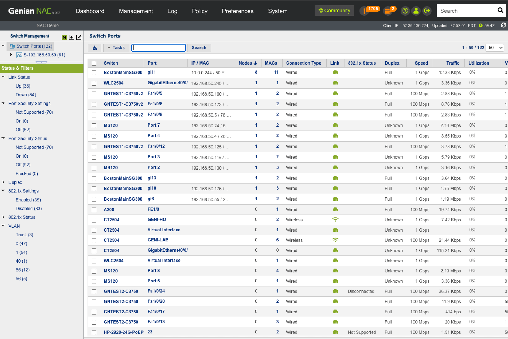 See how many devices are connected to specific ports, their connection status, port-level security, 802.1x information, traffic, utilization and more. Using 802.1x port-based access control, control any ports connected to non-compliant devices.